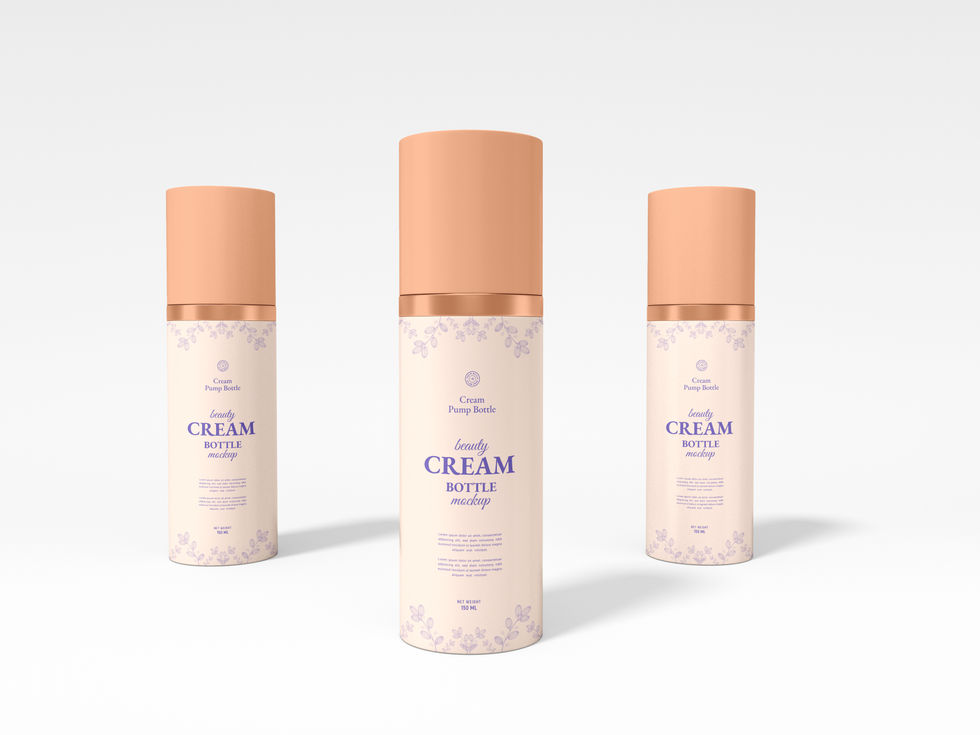 A collection of images showcasing various peach-colored cosmetic cream bottles with floral designs and minimalist glass bottles with metallic caps.